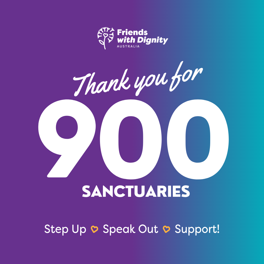 Friends with Dignity Our 900th Sanctuary 900 Sanctuaries. 900 fresh starts. This week, we reached a milestone that speaks volumes:900 fully furnished homes created under our Sanctuary Program for victim-survivors of domestic violence.That’s:900 kettles, to make that first cup of tea. 900 toasters, microwaves and kitchen sets for...