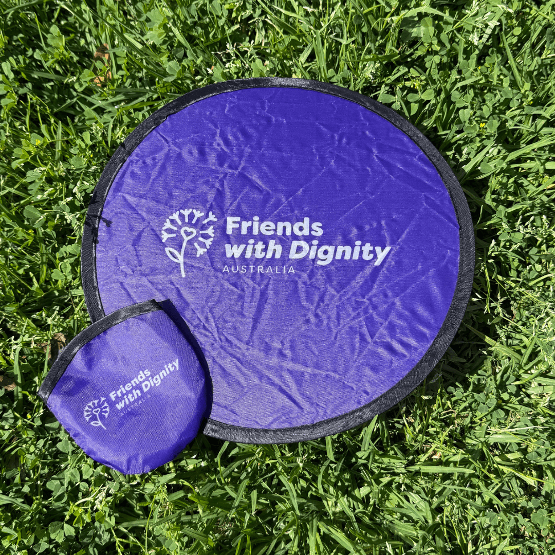 Stay cool and show your support with our Friends with Dignity twist-and-fold fan. Lightweight, portable, and perfect for events, summer days, or keeping in your bag on the go!